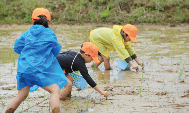 大自然の中で泥んこになりながら、五感をフルに使って田植えに挑戦!